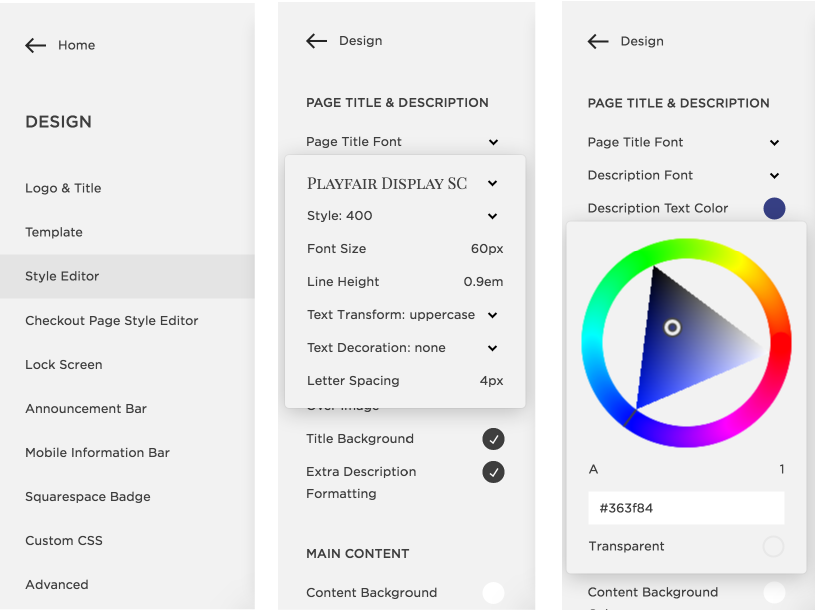 Now, all Squarespace templates make use of a feature called the Style Editor. The Style Editor enables you to change say the size, color and type of font of your body text and headings. You also input your brand colours here, say colouring your newsletter block, your navigation background, announcement bar and site buttons to match your brand.
