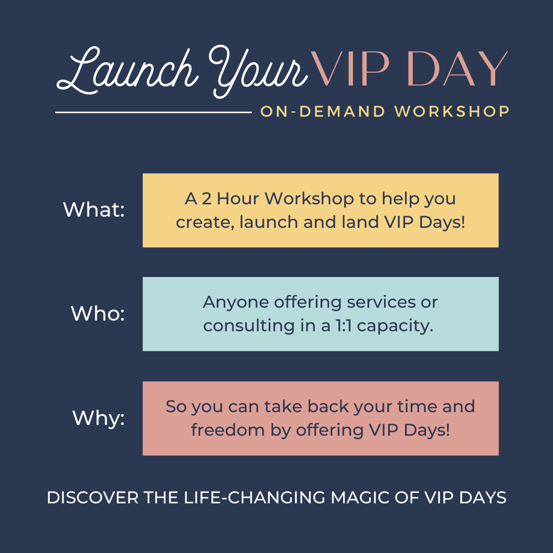If you want help setting this system up in your business by the way, my friend Sara Masci has a 4 day workshop on this called Launch Your VIP Day which will help you create, launch, and land your first VIP day client.