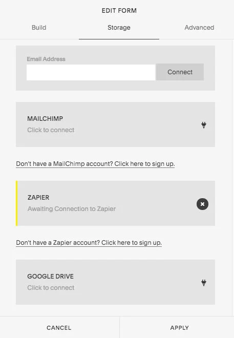 Under the storage tab of your form editor, select “connect zapier” so it turns yellow and says “awaiting connection to zapier.”