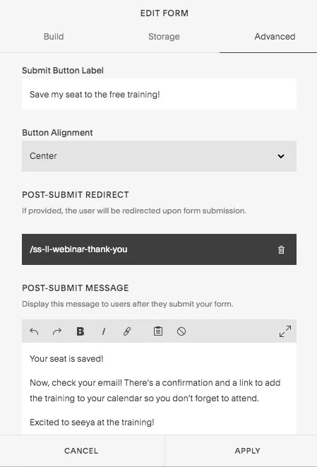 Type a post-submit message so users know their seat is saved in the webinar!