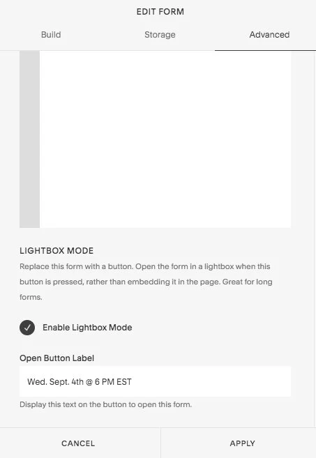 If you wish for your form block to appear as a sleek little button instead, scroll to the bottom of your the advanced settings and enable lightbox mode.
