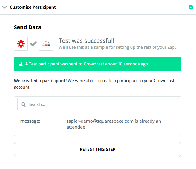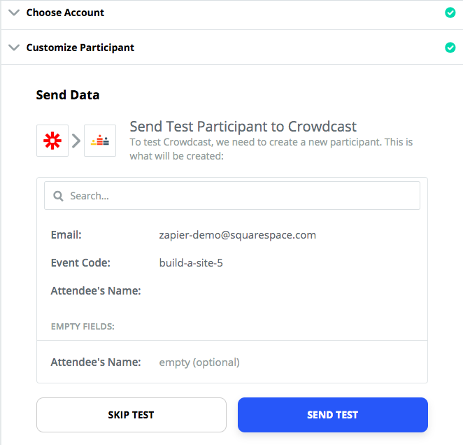 Now it’s time to add in the information that Zapier will be sending from your Squarespace form to your Crowdcast in order to register the participant.