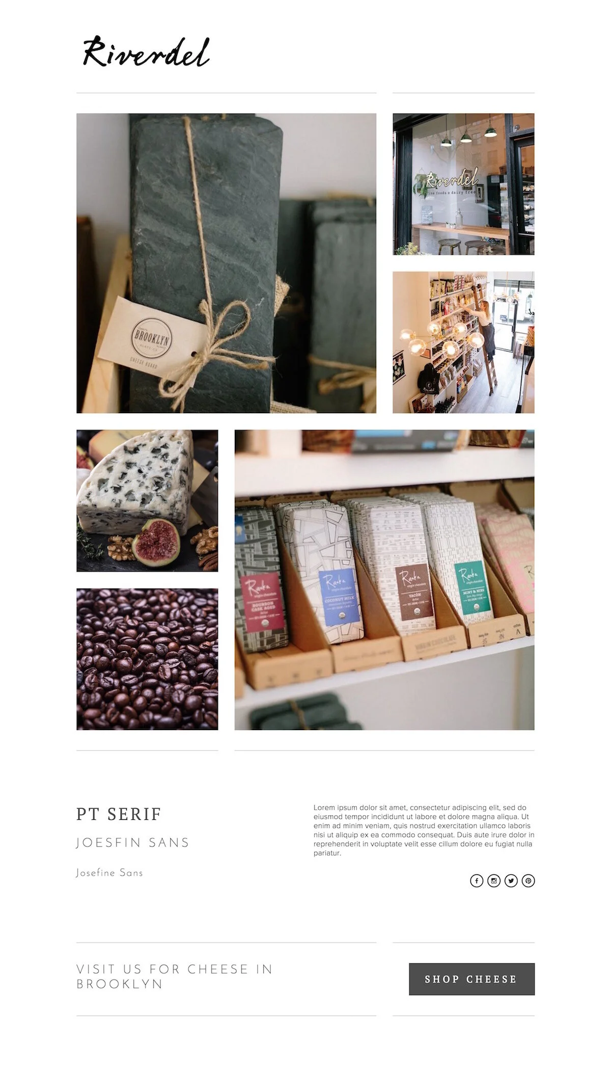 Fonts, colours, button and social icon styles, as well as images to represent the brand are included in the mood board + color palette. In the Riverdel Cheese board, I arranged the photos in the unique layout requested, and went a little more minimalistic than most. Charcoal grey was used throughout, and the amazing photos Riverdel had taken were at the centre of attention. I think we nailed a ‘Brooklyn’ feel, don’t you? Lucky, as I’ve only ever been to NYC, not Brooklyn itself, so I unfortunately don’t have first hand experience.