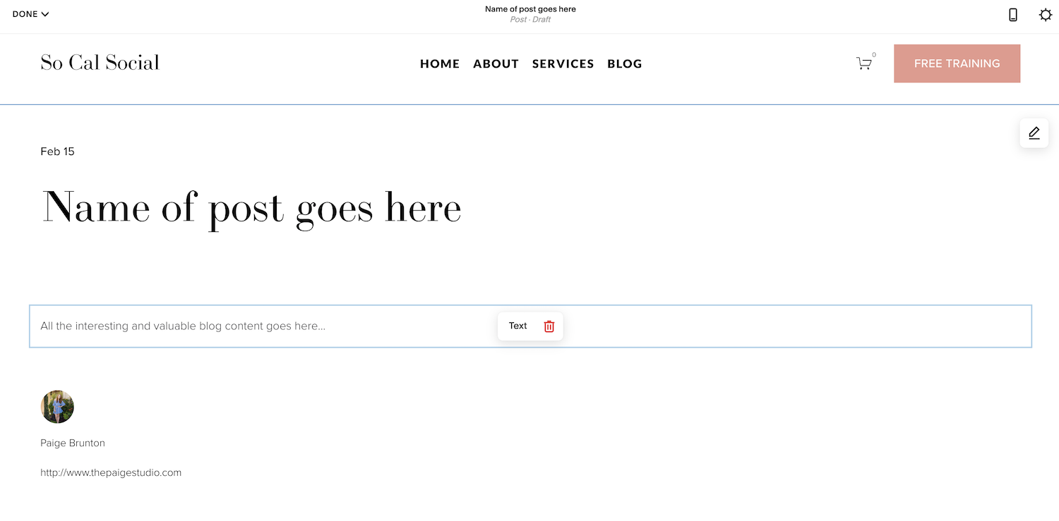 This is where all your content for that specific blog post will live. You have all the same options for adding blocks within a blog post as you do for adding content on any other page of your site.
