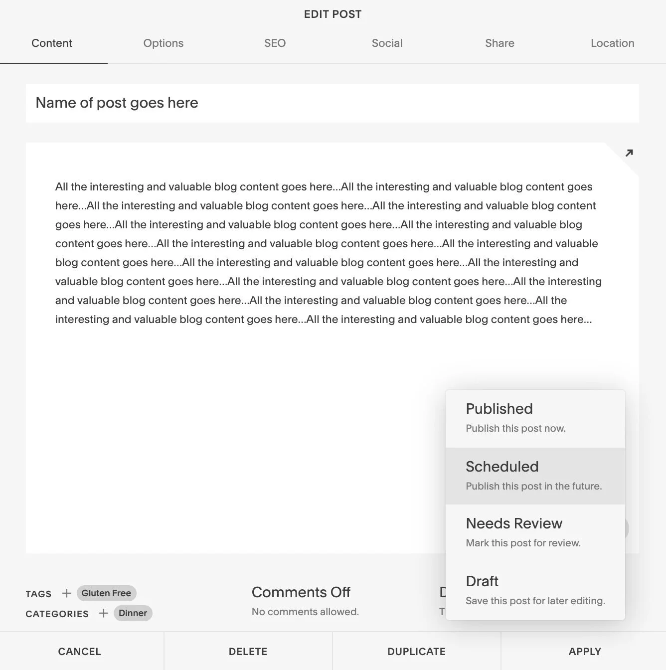 Got your blog post looking just the way you like it? No need to reinvent the wheel the next time you go to create a post. Just use your previous post as a sort of template by pressing duplicate!