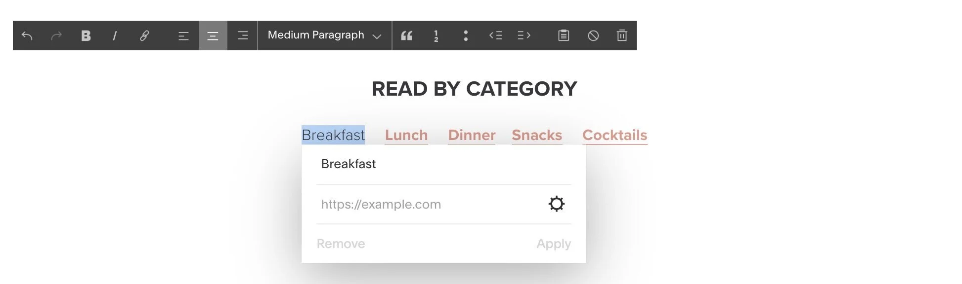 Want to help readers quickly get to where they want to go? Allow them to sort using categories! The easiest way to do that is to add a text block somewhere near the top of your page, write out the names of your 3-5 categories to create a simple text link for each.
